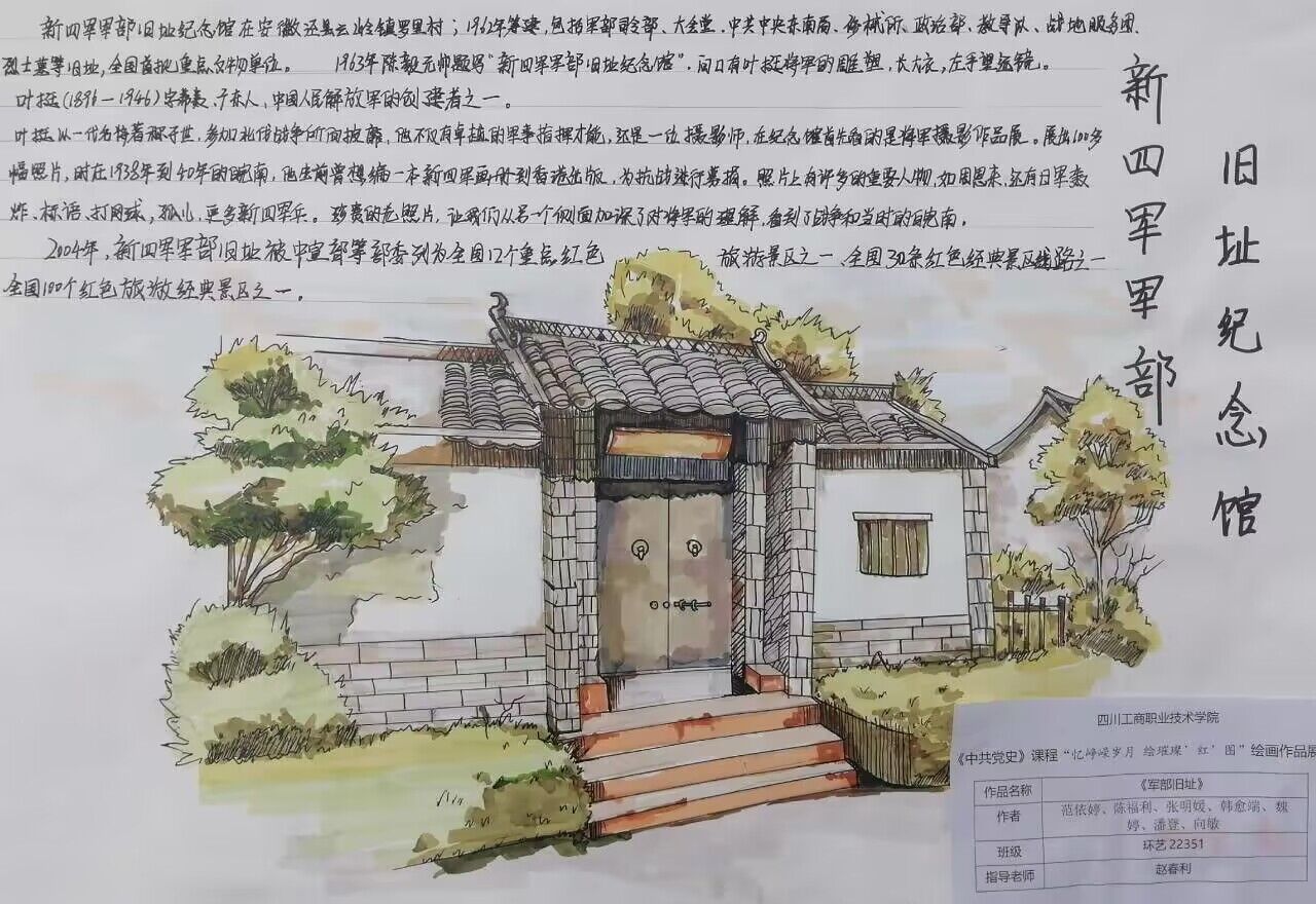 手绘过程中,同学们借助铅笔、钢笔、水彩笔、马克笔、剪刀等工具,通过素描、水彩、剪纸、智能绘画等多种艺术形式进行主题创作,对历史红色场景进行复刻、绘制,对红色历史建筑进行艺术化加工,完成创作。