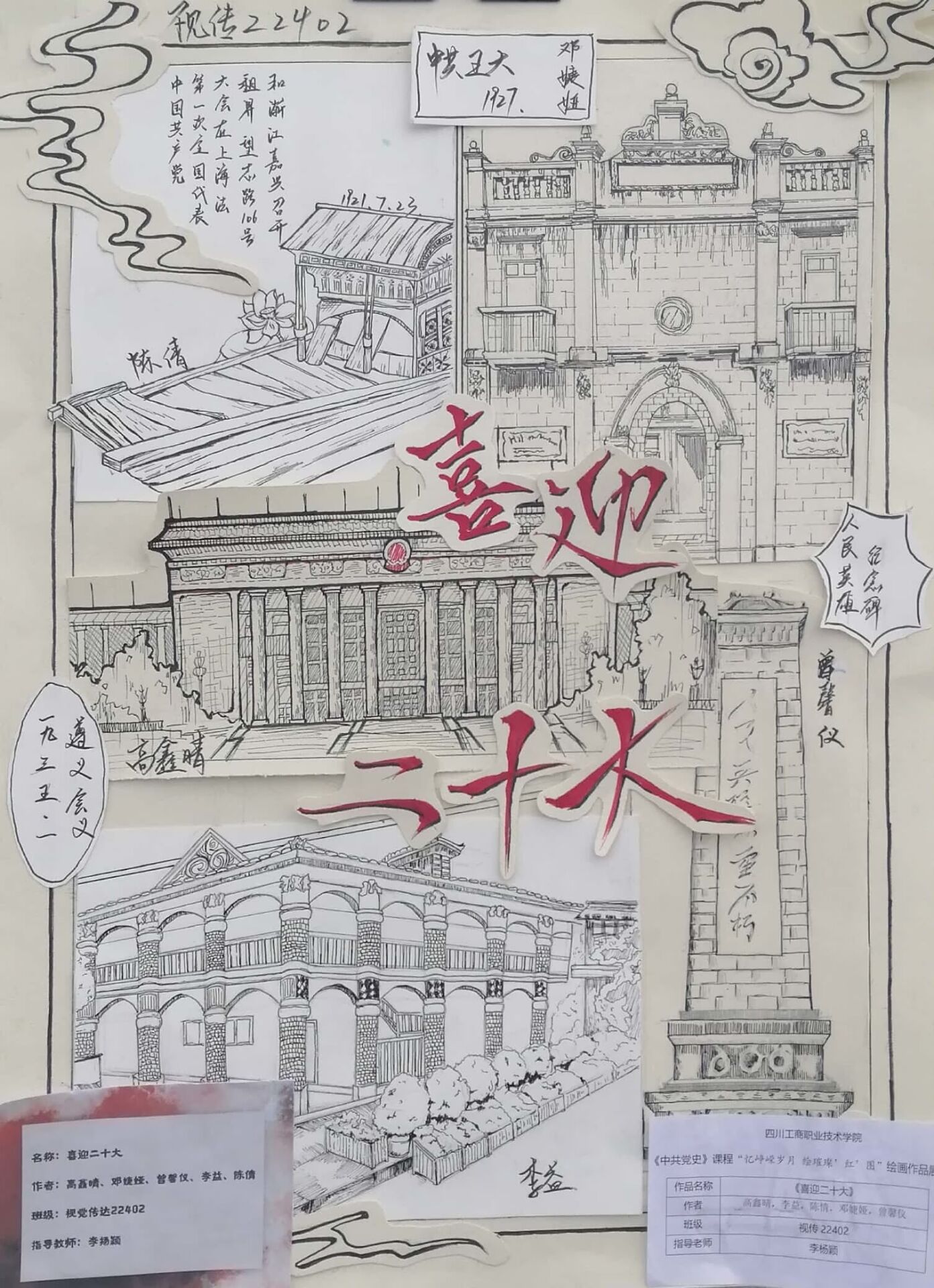 在威廉williamhill体育四史教研室老师们的指导下,大一的同学们经过一个月的准备,同学们将党史红色会址与艺术相结合,点燃红色记忆,手绘红色会址,致敬百年党代会,礼赞二十大,表达同学们坚定理想信念,感党恩,听党话,跟党走的坚定信心和决心。